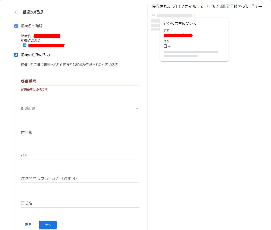 この状態で既に右側のプレビューには入力した組織名と国が出てくるんで、ここで想定してたものと違ってる場合大体勘違いか間違ってます。戻ってやり直しましょう。