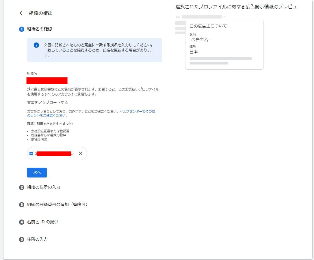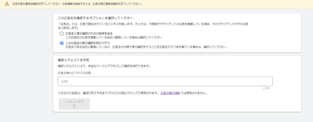 ・広告主確認のオプション選択:広告主の身元主確認を自分で行う