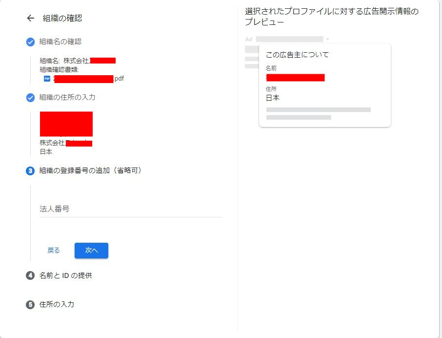 一応Googleから通知来てから30日以内に実行しないといけない(はず)なのと、現状もうGoogleで継続して配信しようって思う場合は基本全てのアカウントでこれを実行しないといけないって思った方が良いので、いつ来ても良いように謄本等書類は受け取れる関係性は築いておいた方がよいなあと思います。