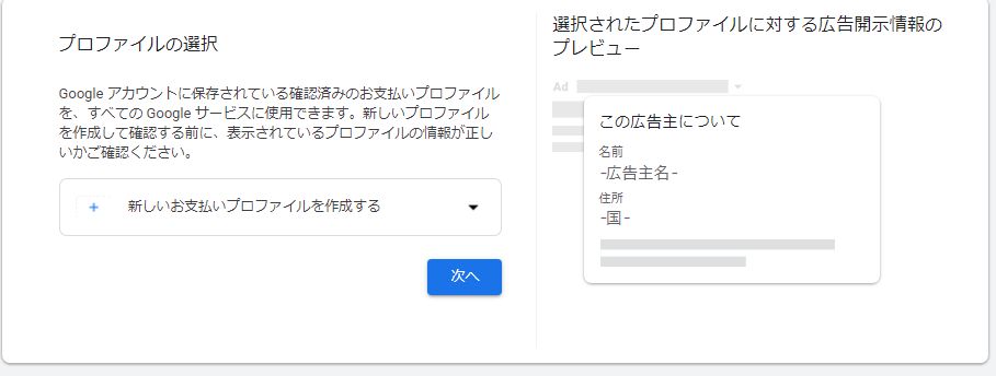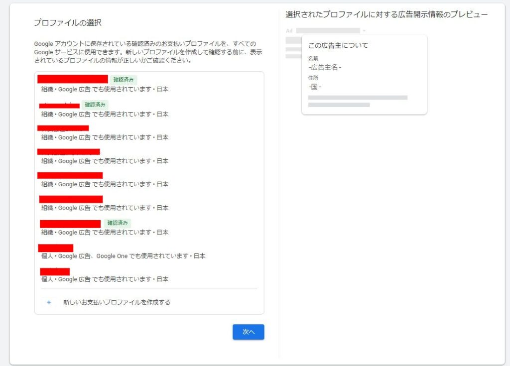 どこに躓いたでいくと一番ここだったけど、今まではプロファイルを選択する。というのがそもそもなかった。後当然だけど自分で選択できるプロファイルの情報は自社だったり自分の所持してるものなのが基本だと思うんですよね。なので、ここで脳死で今このアカウントに支払に使ってるプロファイル入れよ~って入れちゃうと後々広告開示情報の広告主名が自分(代理店)になります。まじ注意
